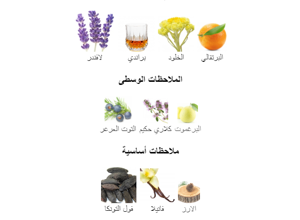 هذا العطر يتألف من مكونات يفضلها الرجال حيث يبدأ بنكهات شراب البراندي و زهرة الخلود ، اللافندرو البرتقال.