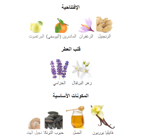 • قاعدة العطر تتكون من فانيليا بوربون, العسل, حبوب التونكا و نجيل الهند .