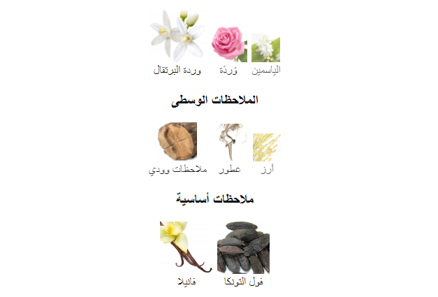 يتألق التكوين العطري برفقة باقة متألقة تفتتحها القمة العطرية مع الورد والياسمين وزهر البرتقال.