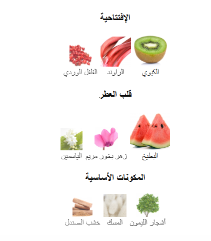مكوناته المتوسطة هي الشمام ونبات بخور مريم والياسمين.