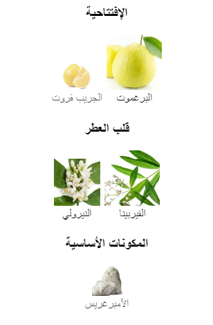 تتكون تركيبته العطرية من الجريب فروت والبارغموت وزهرة البرتقال ونبات راعي الحمام ودهن العنبر