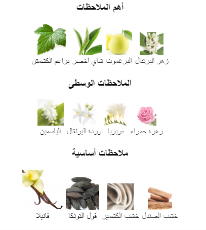 يدخل في التكوين العطري مجموعة منعشة من المكونات تتمثل في تألق قطرات زيت البرغموت